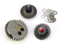 実銃の様に、リアルなリコイルショックを生み出す次世代電動ガン・シリーズ。そのギミックは、リアルで強烈な反動を生み出す反面、今までの電動ガンとは比べ物にならない程、様々な部分に負担が蓄積され易くなっています。各部のゆるみや内部の摩耗・損傷部品の交換といった、実銃同様の定期メンテナンスが必須条件になりつつあります。なかでもパワーソースとリコイルエンジンを同時に作動させるギアやピストン部に至っては、最も高負担を強いられており、通常電動ガンに比べ1/2-1/4まで耐久寿命が低下(ライラクス社テスト比)しています。ライラクス社ではノーマルの耐久テスト結果を元に、様々なパターンのテストを繰り返し行い、各ギア部の素材の組合せ、加工方法、浸炭・高周波焼き入れ、ショットピーニング等の耐久性を高める様々な工程や処理を施し、リコイルエンジンを搭載した次世代型に適したギアを完成しました。
