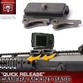 ●素早く着脱可能なクイックリリースタイプ! ●銃のレイルにビデオカメラやナイトビジョン、サーマルビジョンの取付けが可能に! ●高品質で高精度な日本製!! 近年ビデオカメラの小型軽量化が進みスポーツシーンの動画撮影などに特化した商品も市場に多く見られるようになりました。 そこで銃本体に小型のカメラを取付けリアルな視点の映像と臨場感を得たいとお考えのユーザー様にお勧めするのがこのカメラマウントベースです! カメラ用三脚に使われているネジ規格を採用し、規格に適合したネジ穴を持つ製品であればウェアラブルカメラやデジタルカメラはもちろんのことナイトビジョンやサーマルビジョンなどの光学機器にも対応します! ベース本体は軽量高強度なアルミ合金製の純国内加工生産品! ピカティニー規格レイルに各種カメラを取付けることが可能です!! 各種レイル対応機器を強固に取り付ける事ができるだけでなくクイックに取り付けが可能になります。 |