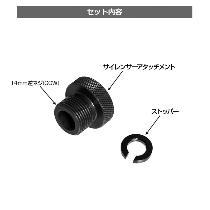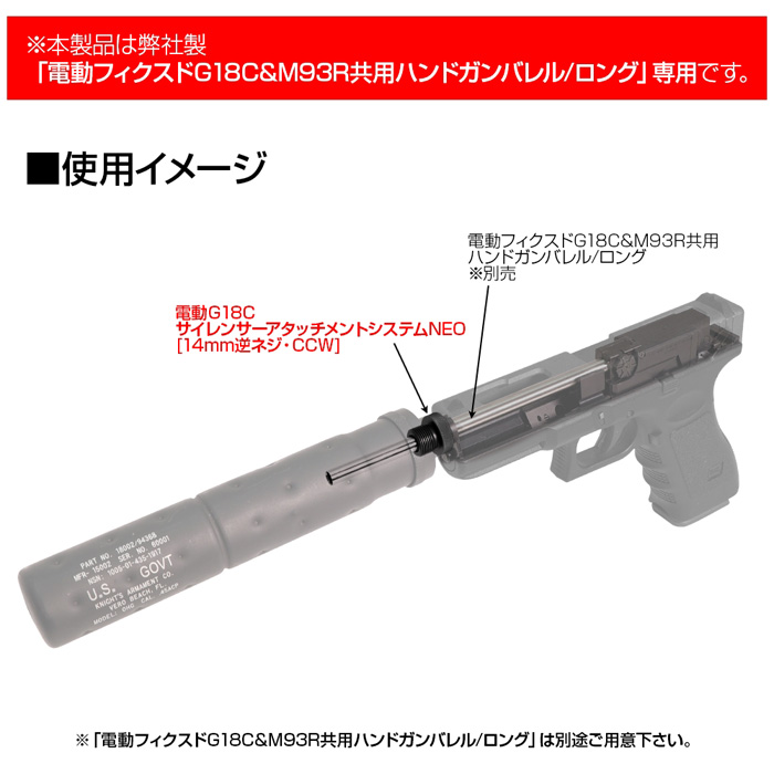 ライラクス社製「電動フィクスドG18C&M93R共用ハンドガンバレル/ロング」と共に使用し、14mm逆ネジ対応の各種マズルオプションを取り付けることができます。 ■仕様:14mm逆ネジ ■注意: ※本製品は弊社製「電動フィクスドG18C&M93R共用ハンドガンバレル/ロング」専用です。 ※銃本体、サイレンサー等のパーツは付属しておりません。 ※画像はサンプル(試作)の為、実際の色や仕様と異なる場合がございます。 |