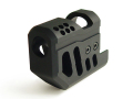 どんな銃でも射撃時には必ず反動と跳ね上がりが生じ、連続的に発射した場合は標的への照準ブレが大きくなっていきます。ターゲットへ連続かつ正確に射的する為に、弾丸発射時の年少ガスを指向性に噴出させ、銃口の跳ね上がりや反動を抑制する装置をコンペンセイターと言います。生死を分けたCQB戦では、標的を確実に葬る為にダブルタップ(2連続発射)が基本前提であり、コンペンセイターの有効性は計り知れないものです。また、競技の場合でも同様で、2射目への斜線移動を少しでも正確に行う為に多くのユーザーが使用しています。エアガンの場合、発射ガスは反動や跳ね上がりを抑制するだけのエネルギーがない為、ドレスアップ的なアイテムと思われがちですが、実はフロントを若干重くすることで、跳ね上がりや最ティング時のブレを軽減するウエイトバランス的な要素があり、射撃時の安定効果に繋がります。今回、単純形状の多い実物品をコピーしたデザインではなく、あくまでもエアガン専用に考え、書き起こした新デザインでご提案いたします。重量もただ重たくしただけではなく、重すぎず軽すぎない実射性能を考慮したウエイトバランスを実現。また、アルミ合金からのオール切削加工による重厚な質感が、さらなる満足感を与える逸品となるでしょう。