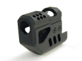 どんな銃でも射撃時には必ず反動と跳ね上がりが生じ、連続的に発射した場合は標的への照準ブレが大きくなっていきます。ターゲットへ連続かつ正確に射的する為に、弾丸発射時の年少ガスを指向性に噴出させ、銃口の跳ね上がりや反動を抑制する装置をコンペンセイターと言います。生死を分けたCQB戦では、標的を確実に葬る為にダブルタップ(2連続発射)が基本前提であり、コンペンセイターの有効性は計り知れないものです。また、競技の場合でも同様で、2射目への斜線移動を少しでも正確に行う為に多くのユーザーが使用しています。エアガンの場合、発射ガスは反動や跳ね上がりを抑制するだけのエネルギーがない為、ドレスアップ的なアイテムと思われがちですが、実はフロントを若干重くすることで、跳ね上がりや最ティング時のブレを軽減するウエイトバランス的な要素があり、射撃時の安定効果に繋がります。今回、単純形状の多い実物品をコピーしたデザインではなく、あくまでもエアガン専用に考え、書き起こした新デザインでご提案いたします。重量もただ重たくしただけではなく、重すぎず軽すぎない実射性能を考慮したウエイトバランスを実現。また、アルミ合金からのオール切削加工による重厚な質感が、さらなる満足感を与える逸品となるでしょう。