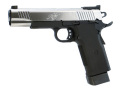 | ステンレスシルバーメッキを施したスライドとブラックHWのフレームの組合せが際立つ、ツートーンモデル! BB弾を発射、ブローバック、空薬莢が舞う、 究極のリアルシューティングシミュレーション! ●ガス圧で装填、排莢を行う、夢のリアルアクション! ケースレスブローバック銃にも勝る鋭いリコイルショックと共に薬莢を弾き出します。 ●全てがハンドガンの中に! マガジンにガス、アルミ製薬莢(BB弾を装填)を納め、外部ソースの接続やロングマガジンを使うことなく、実銃と全く同じ外観の中に機能を凝縮しました。 ●より汎用性の高い6mmBB弾を使用。 ●装弾数を12発とし、排莢式ブローバックアクションを存分にお楽しみ頂けます。 |