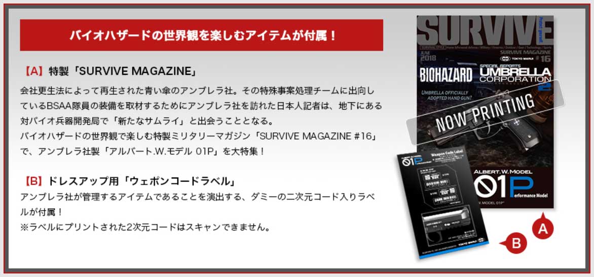 ゲーム『バイオハザード7 レジデント イービル』にて、青い傘をかかげるアンブレラ社の存在が明らかになった。赤い傘という過去の反省から青い傘となったアンブレラ社は、国連主体の対バイオテロ部隊BSAAをサポートするべく“特殊事案処理チーム”と名付けた出向機関を設け、“対バイオ兵器開発局”ではBSAAの管理下で兵器開発も行っている。そこで生まれたのが、対バイオテロ兵器「アルバート.W.モデル 01P」だ。「アルバート.W.モデル 01P」は、特殊事案処理チームの標準装備として採用されている。クリス・レッドフィールドが愛用している「サムライエッジ〈アルバート.W.モデル 01〉」から派生した量産モデルだが、汎用性を追求したパフォーマンスモデルであり、状況を選ばず性能を発揮できるよう設計されているのだ。 そのポテンシャルについては、特殊事案処理チームに配属されたBSAA隊員らが多くの実績をあげていることで証明されている。